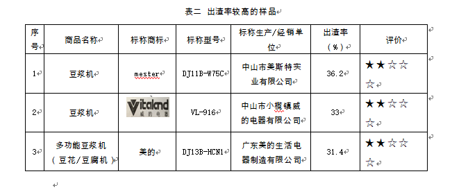 此外,豆渣越少,出渣率越低,說明制漿能力越強。18件樣品中,出渣率最低為16.4%,最高達到36.2%,兩者數值相差超過1倍。其中,mester DJ11B-W75C豆漿機、中山市小欖鎮威的電器有限公司生產的VL-916豆漿機,美的DJ13B-HCN1多功能豆漿機(豆花/豆腐機)出渣率較高,均超過30%(見表二)。